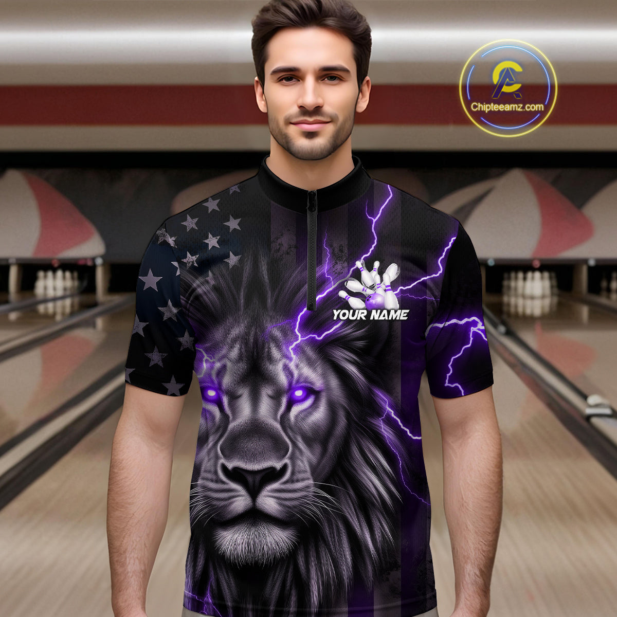 Custom Purple Thunder Lightning Patriotic Lion Quarter-Zip Shirt For Men, US Flag Bowling Jerseys IPHW9321