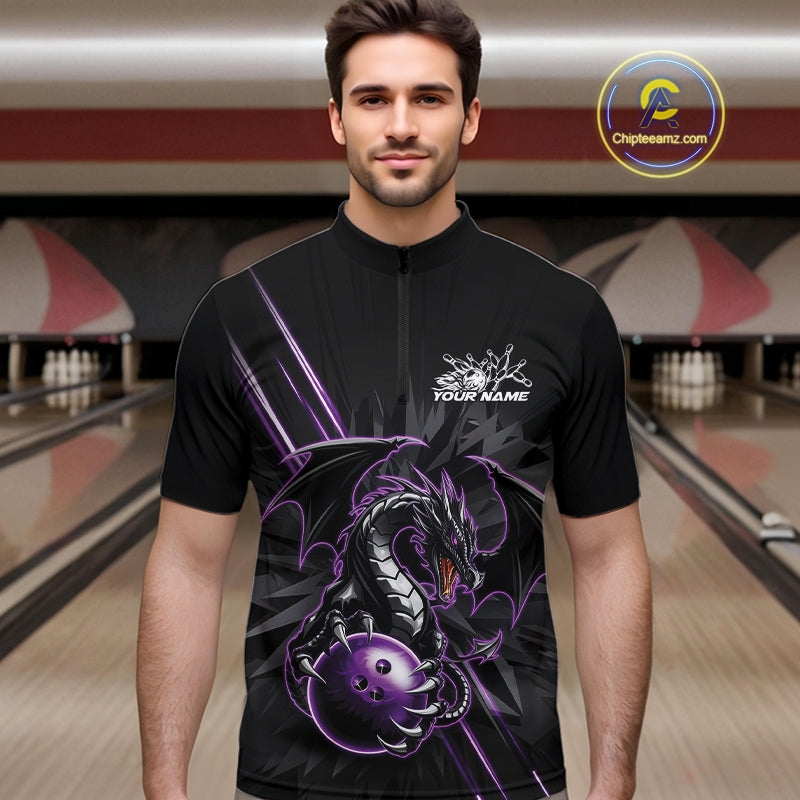 Custom Black And Purple Dragon Bowling Quarter-Zip Shirts For Men, Dragon Bowling Team Shirt IPHW9538