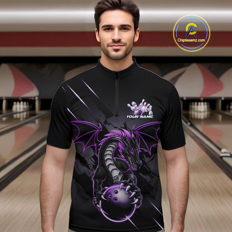 Custom Glowing Purple Dragon Bowling Team Quarter-Zip Shirts For Men, Dragon Bowling Jerseys IPHW9539