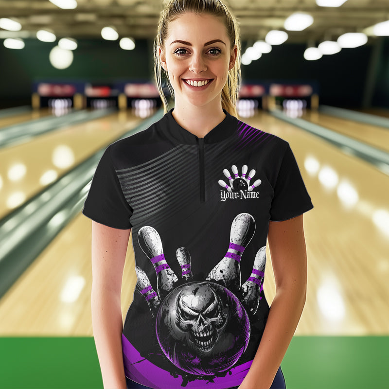 Custom Black And Purple Grunge Style Skull Bowling Women Quarter-Zip Shirts, Team Uniform IPHW8909