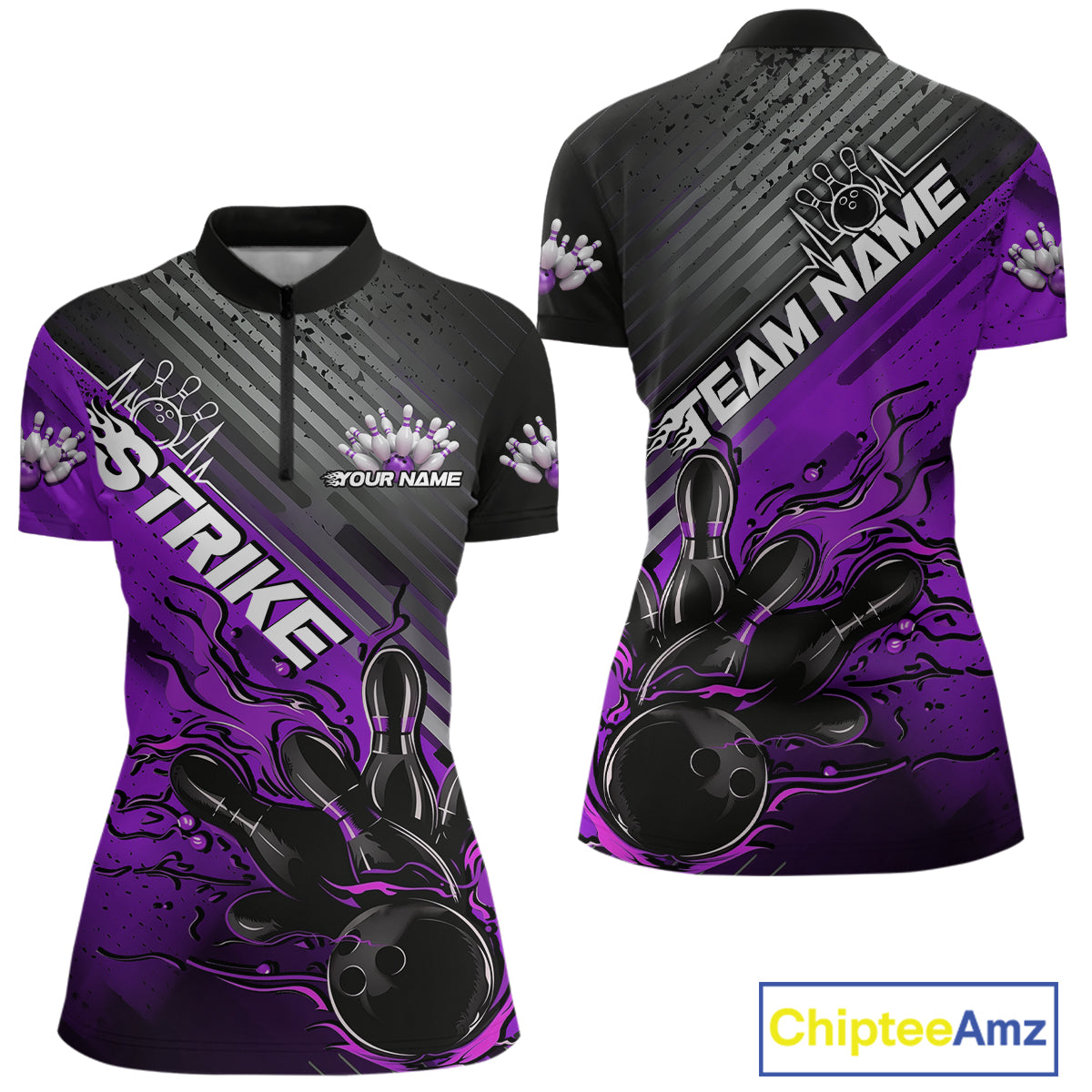 Custom Purple Strike Flame Bowling Women Quarter Zip Shirt, Team Shirt Bowlers Outift IPHW9617