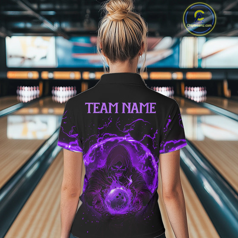 Women bowling polo, 1/4 zip shirts Custom purple flame skull bowling team jerseys, gift for Bowlers NQS10057