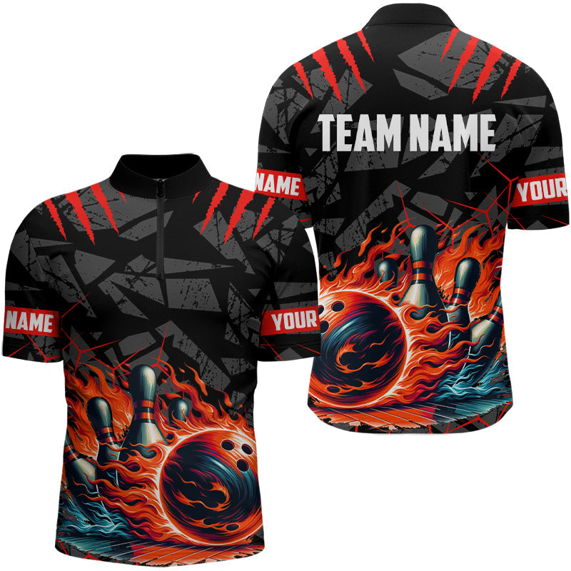 Bowling Polo, Quarter zip shirts for men Custom black & red flame bowling shirt, Team Bowling Jerseys NQS9015