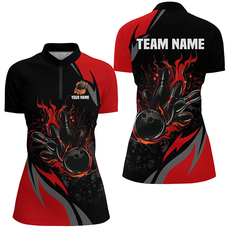 Custom Black And Red Flame Bowling Shirts For Women, Bowling Ball and Pins Team Bowling League Jerseys NQS8346