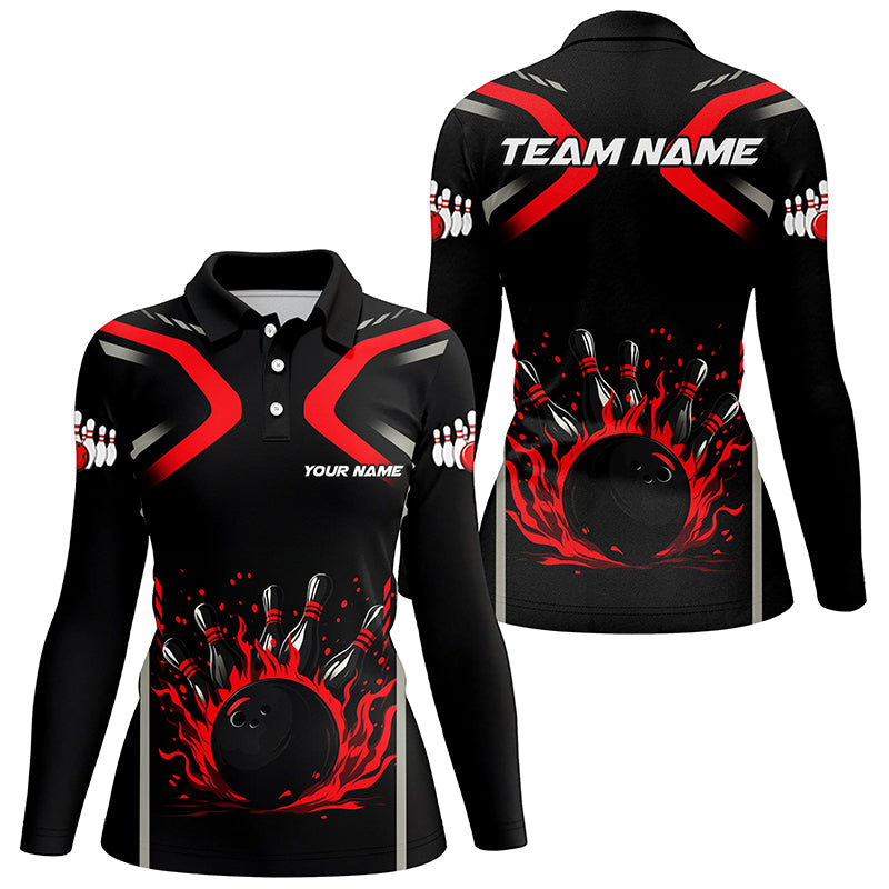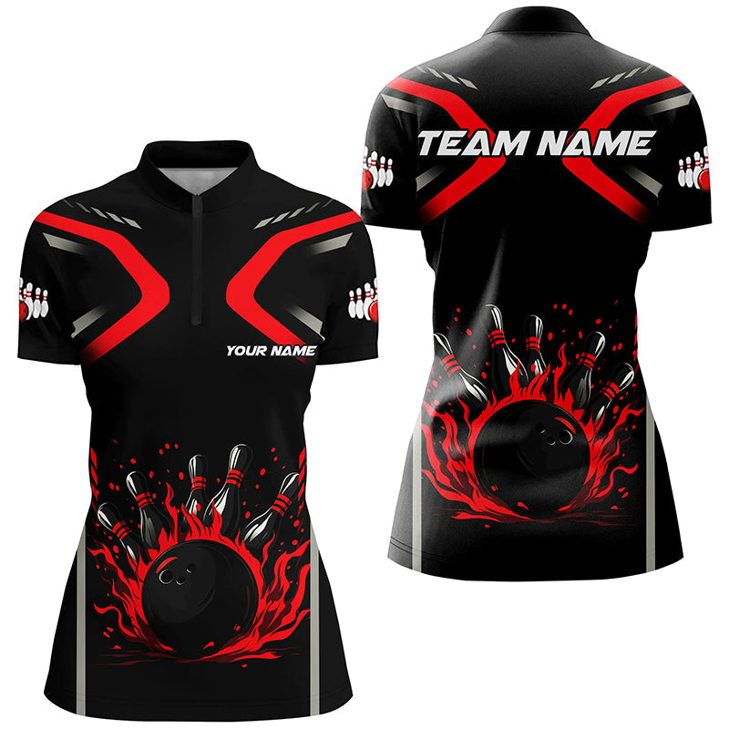Personalized Red & Black Flame Bowling ball pins custom bowling shirts for Women, cool bowling jerseys NQS8341