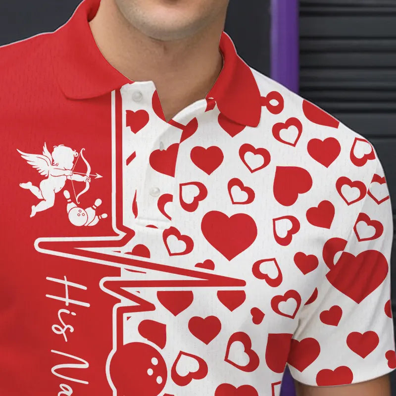 Red Bowling Heartbeat Pulse Line Custom Valentines Day Bowling Polo Shirts For Men IPHW8331