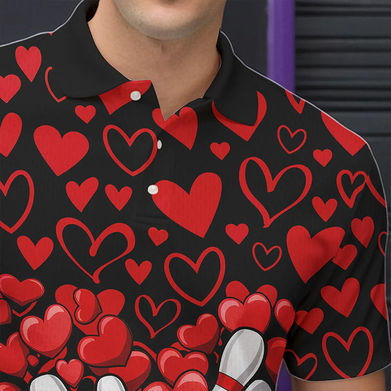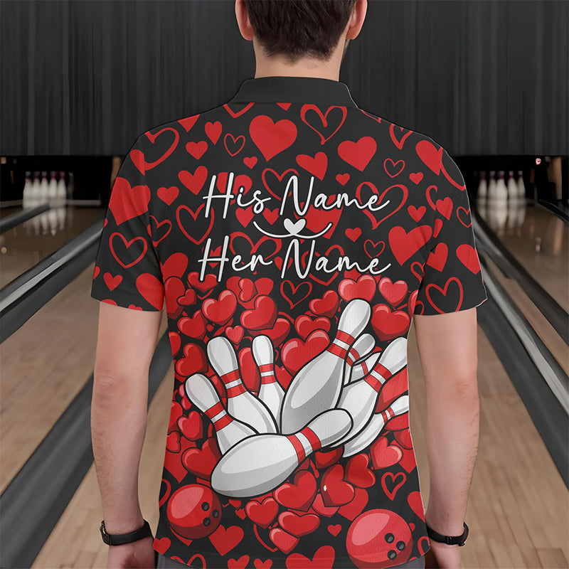 Black And Red Heart Theme Custom Valentines Bowling Polo Shirt For Men, Couple Bowling Shirt IPHW8336