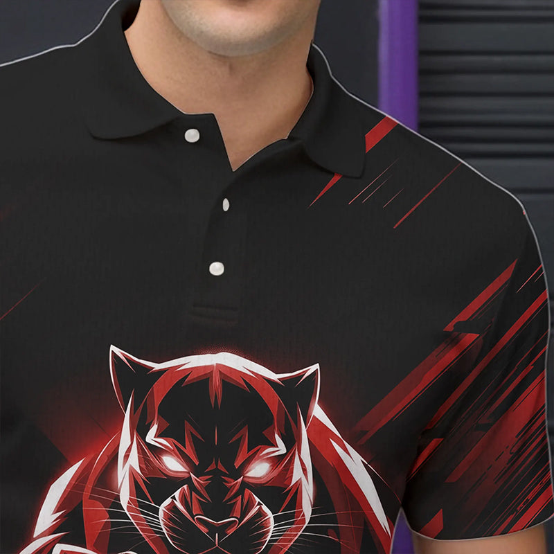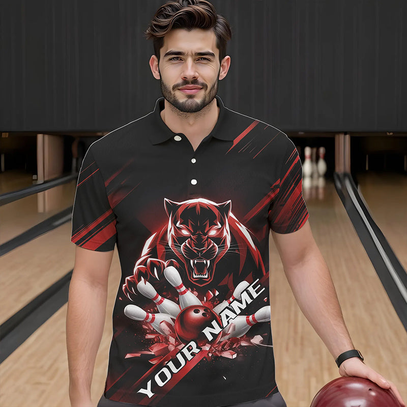 Custom Black And Red Panther Bowling Polo Shirts For Men, Bowling Team Uniform IPHW8564