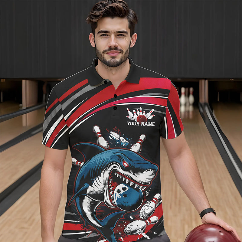 Black And Red Custom Shark Bowling Team Polo Shirts For Men, Shark Bowling League Shirt IPHW8726