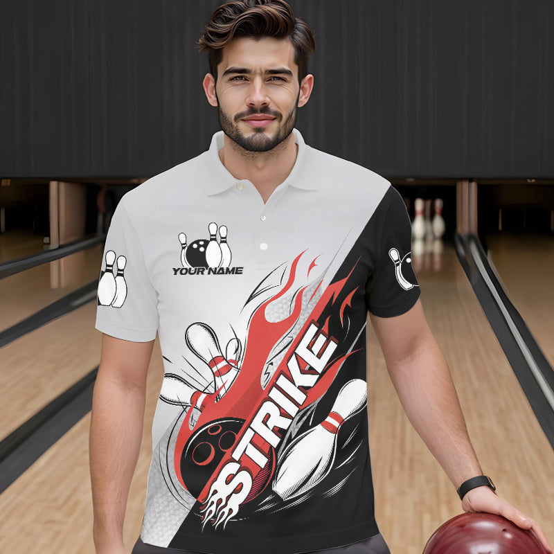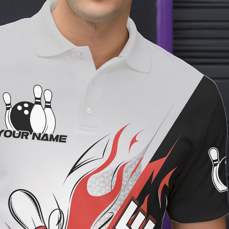 Custom Red Flame Strike Bowling Men Polo Shirts, Bowling Team Uniform Bowling League Shirt IPHW8780