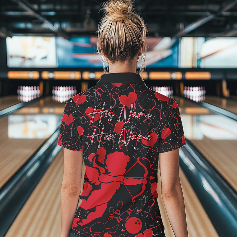 Black And Red Custom Valentines Day Bowling Polo Shirts For Women, Bowling Couple Shirt IPHW8329