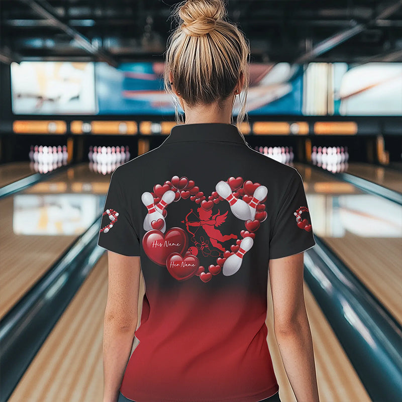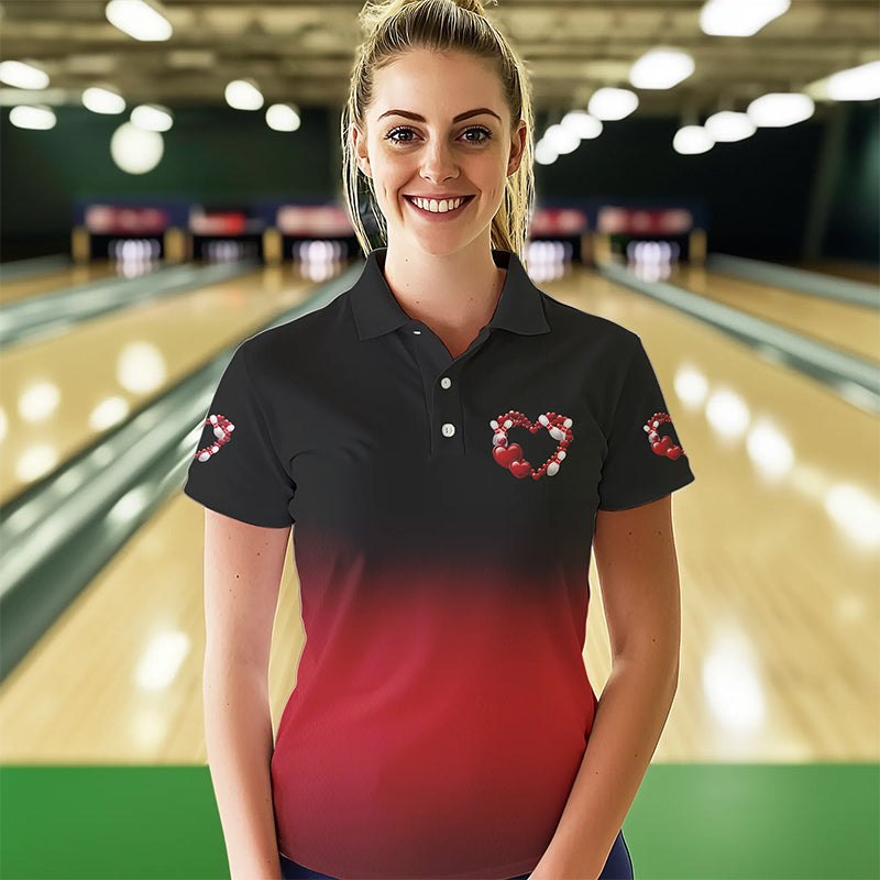 Black And Red Custom Valentines Day Bowling Polo Shirts For Women, Bowling Couple Shirt IPHW8334
