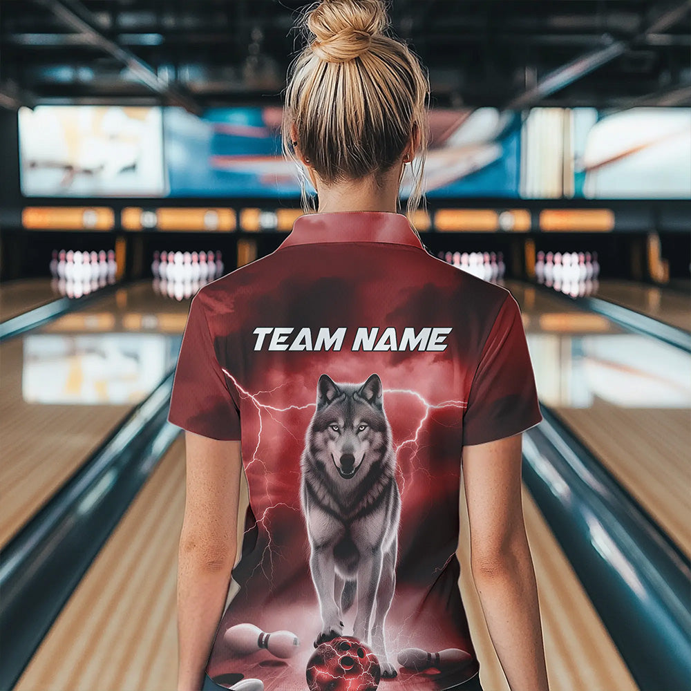 Red Thunder Lightning Custom Wolf Bowling Polo Shirts For Women, Wolf Bowling Team Shirt IPHW8425