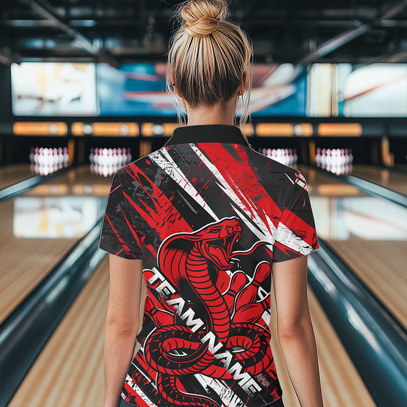 Custom Black And Red Cobra Snake Bowling Jerseys, Bowling Team Polo Shirts For Women IPHW8580