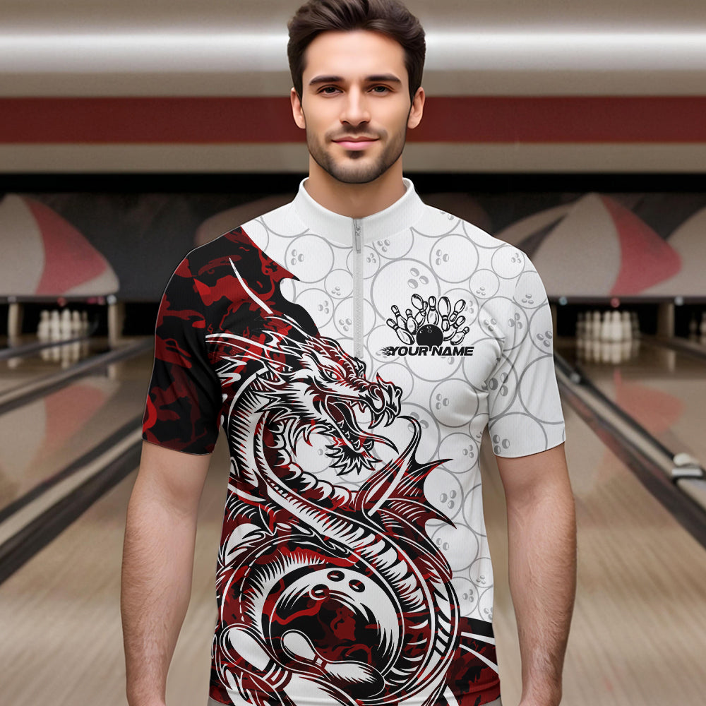 Custom Red Camo Dragon Bowling Tattoo Men Quarter-Zip Shirts, Dragon Bowling League Team Shirt IPHW8883