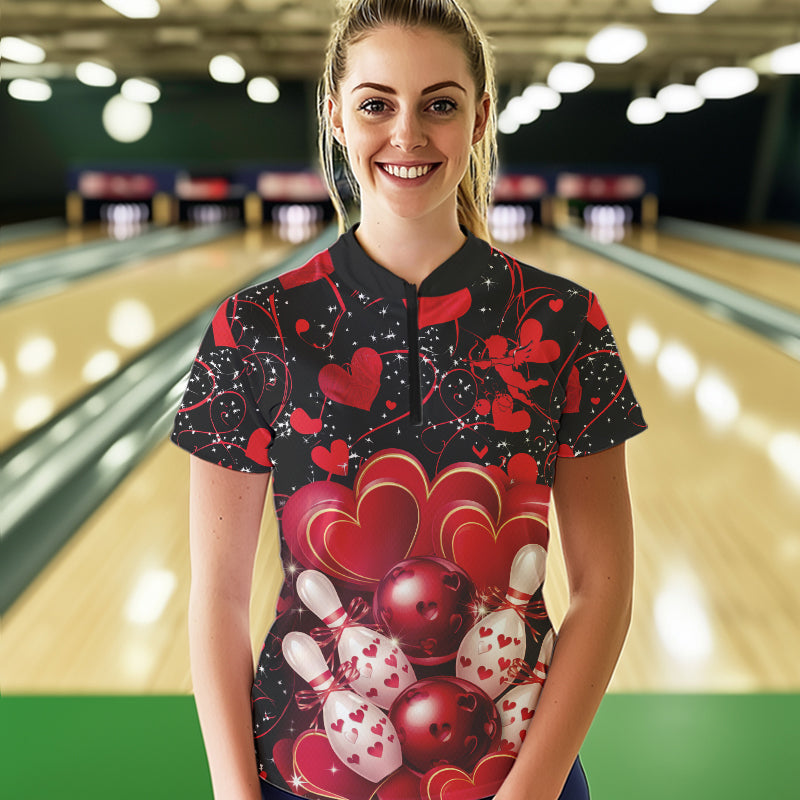 Black And Red Custom Valentines Day Bowling Womens Quarter-Zip Shirts, Bowling Couple Shirt IPHW8327