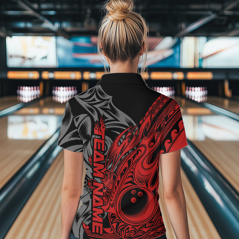 Custom Black And Red Flame Tribal Polynesian Bowling Women Quarter-Zip Shirts, Team Uniform IPHW8807