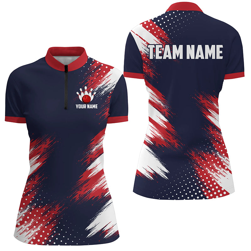 Red Blue White Bowling Shirt For Men & Women Custom Patriotic Bowling Team Jersey 1/4 Zip BDT544