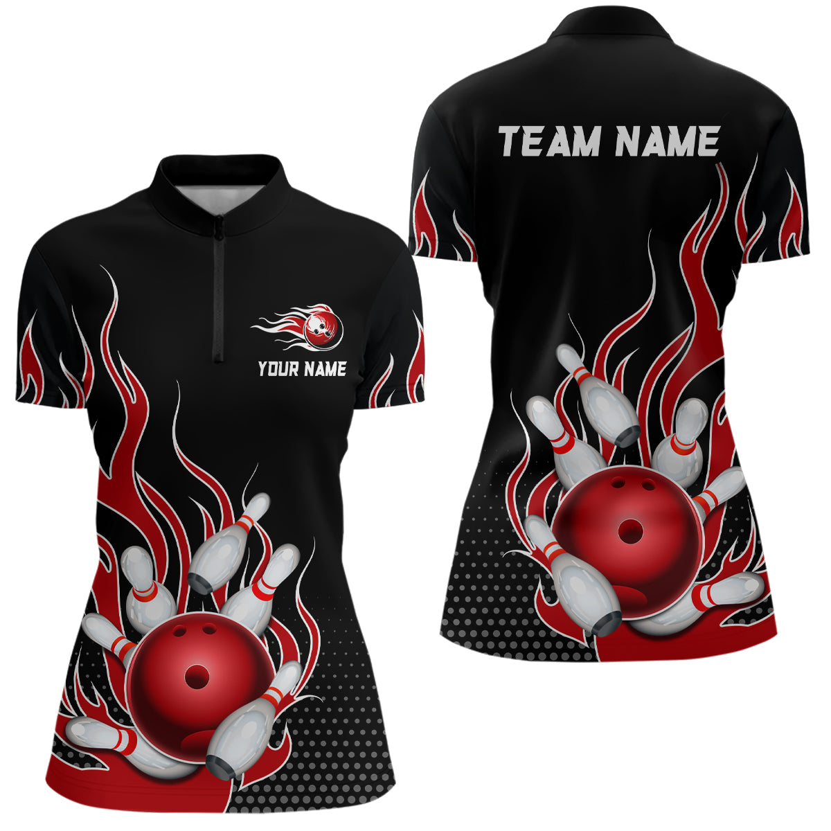 Red Flame Bowling Quarter Zip Shirts for Men And Women Custom Bowling Team Jerseys Unisex BDT477