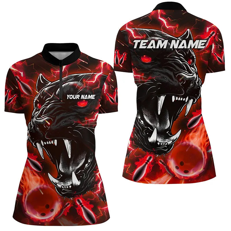 Red Flame Panther Bowling Polo, Quarter Zip Shirts For Women Custom Bowling Team League Jerseys NQS8774