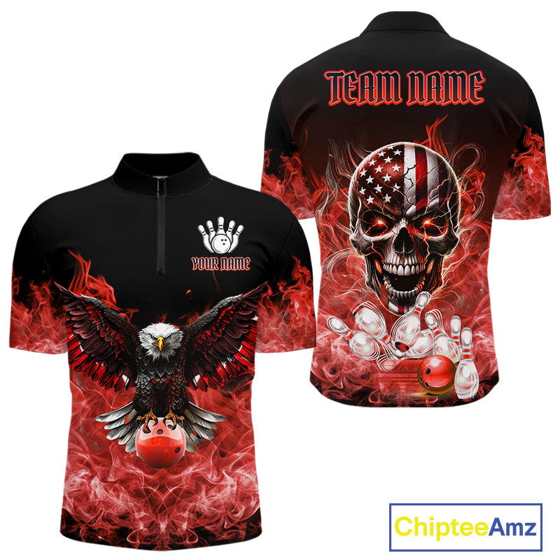 Red Flame Smoke American Flag Eagle Skull Mens Bowling Shirts Custom Patriotic Bowling Team Jersey NQS10279