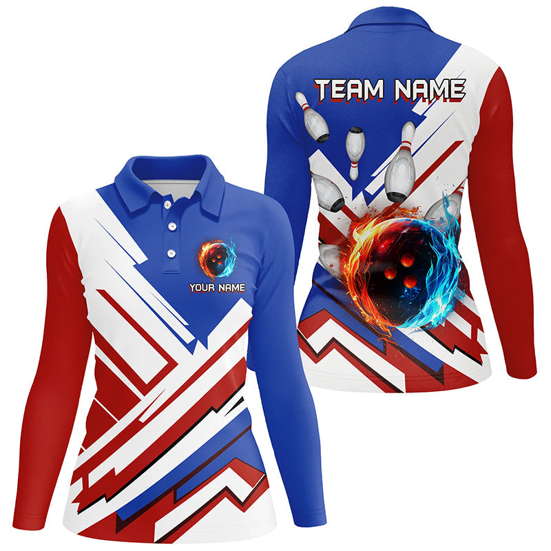 Red, White and Blue Flame Bowling Polo, Quarter Zip Shirts for Women Custom bowling team jerseys NQS7879