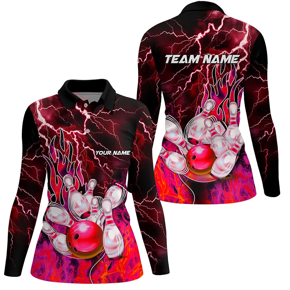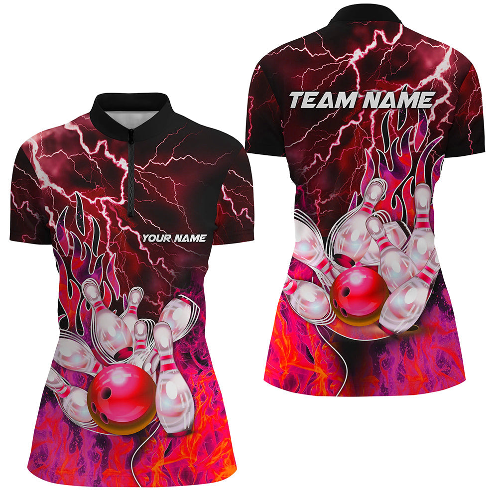 Women Bowling Polo, 1/4 Zip Shirt Custom red lightning thunder Bowling Team Jersey, gift for Bowler NQS8175