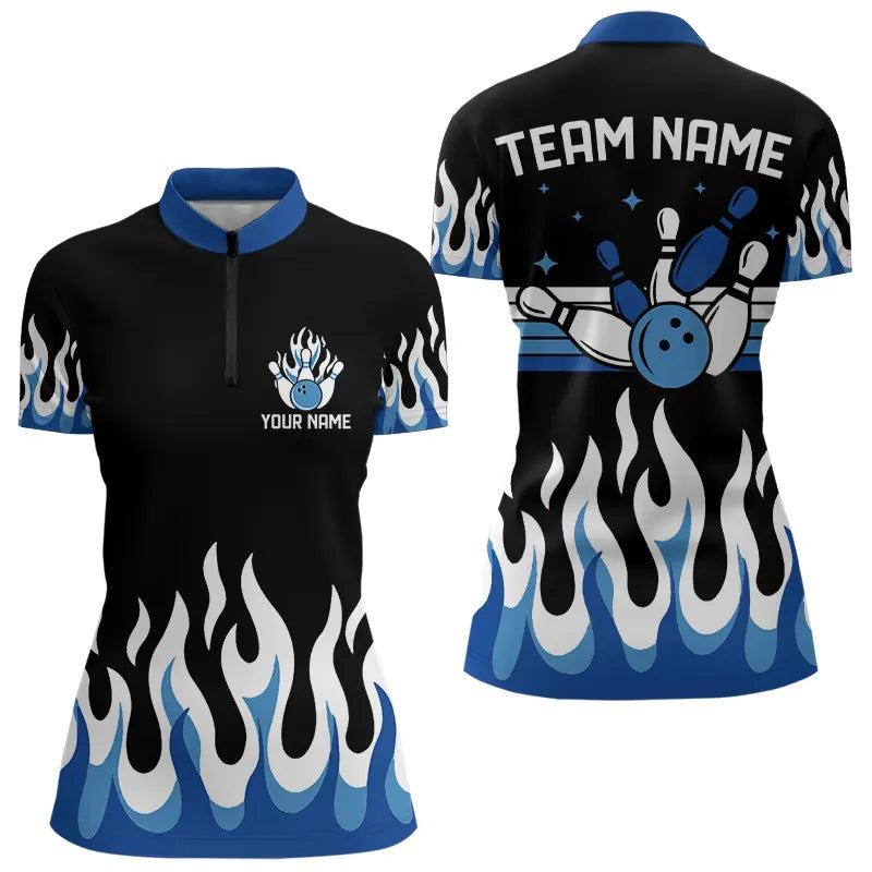 Black and Blue Flame Retro Bowling Polo, Quarter Zip Shirt for Women Custom Bowling Team Jerseys NQS9155