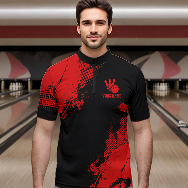 Black and Red Retro Mens Bowling Polo, Quarter Zip shirts Custom team bowling jerseys mens outfit NQS9394