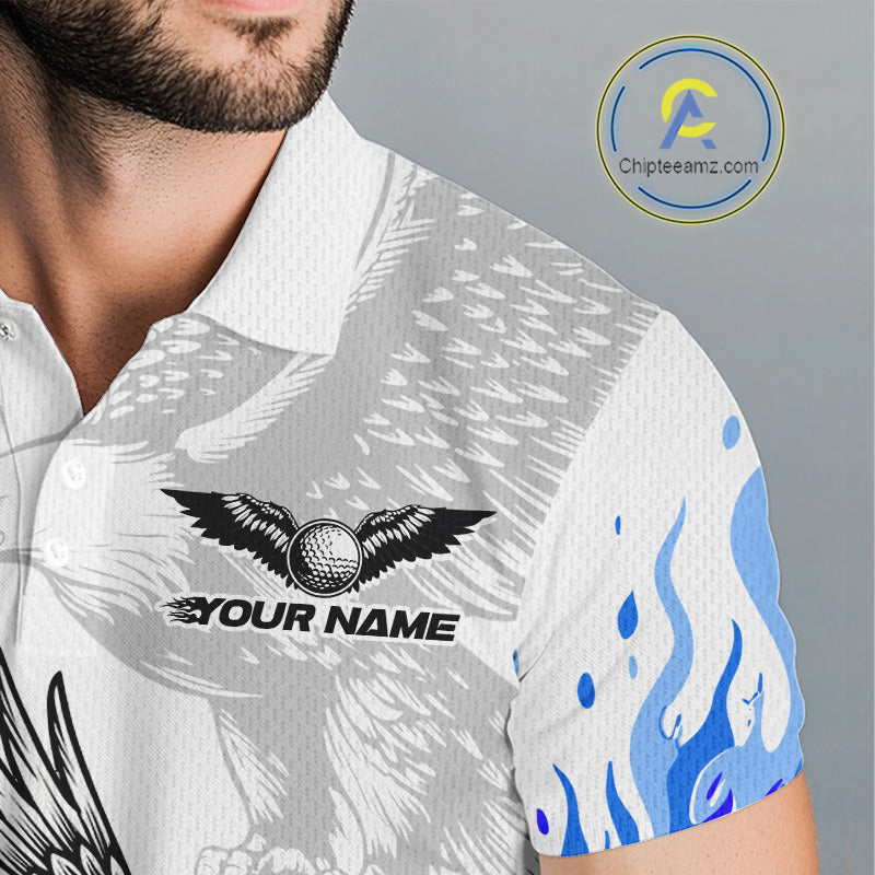Mens Golf Polo Shirt Custom Eagle Blue Flame Golf Tops, Personalized White Golf Outfit For Men NHN0070