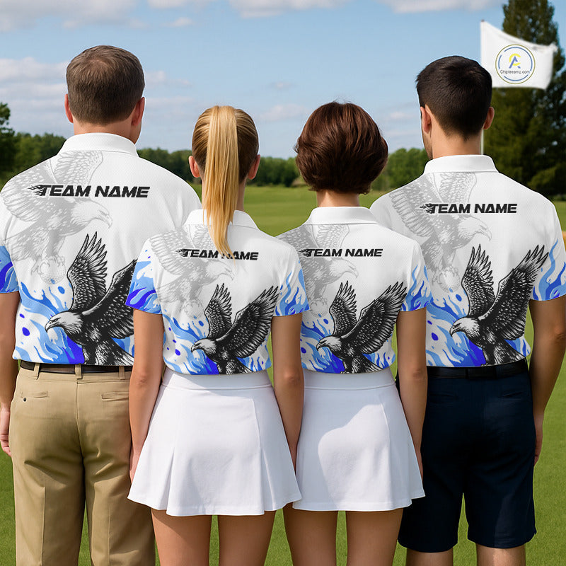 Womens Golf Polo Shirt Custom Eagle Blue Flame Golf Tops, Personalized White Golf Outfit For Women NHN0070