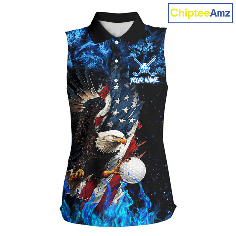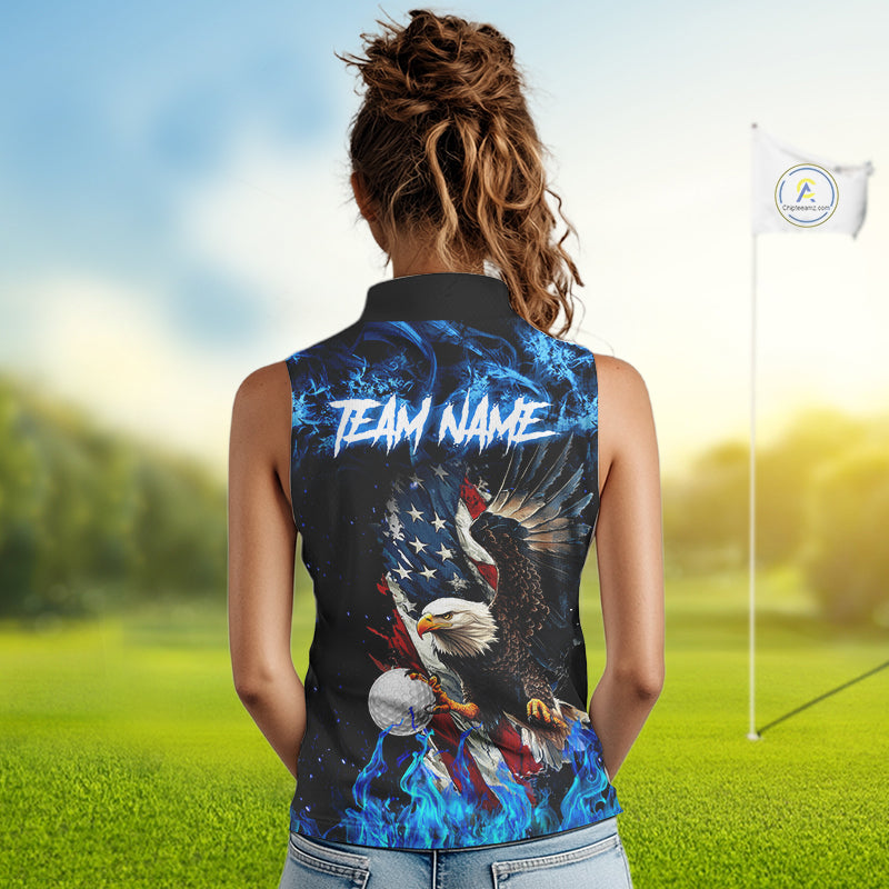 Blue Flame American Flag Eagle sleeveless golf shirts for Women Custom patriotic ladies golf outfit NQS11644