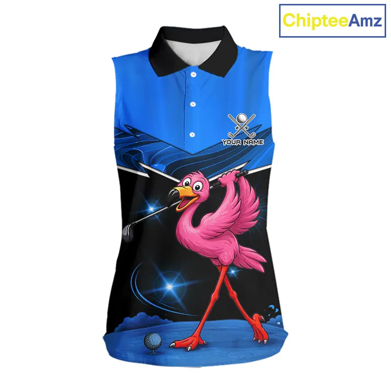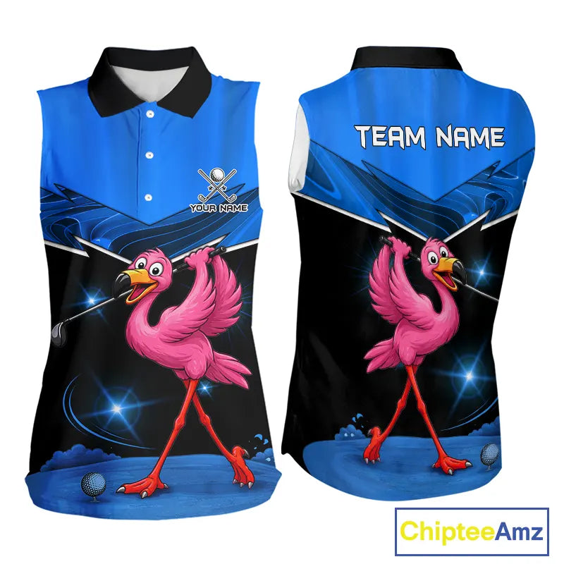 Funny Flamingo Blue Sleeveless Golf Shirt Custom Flamingo Team ladies golf tops, funny golf gifts NQS11676