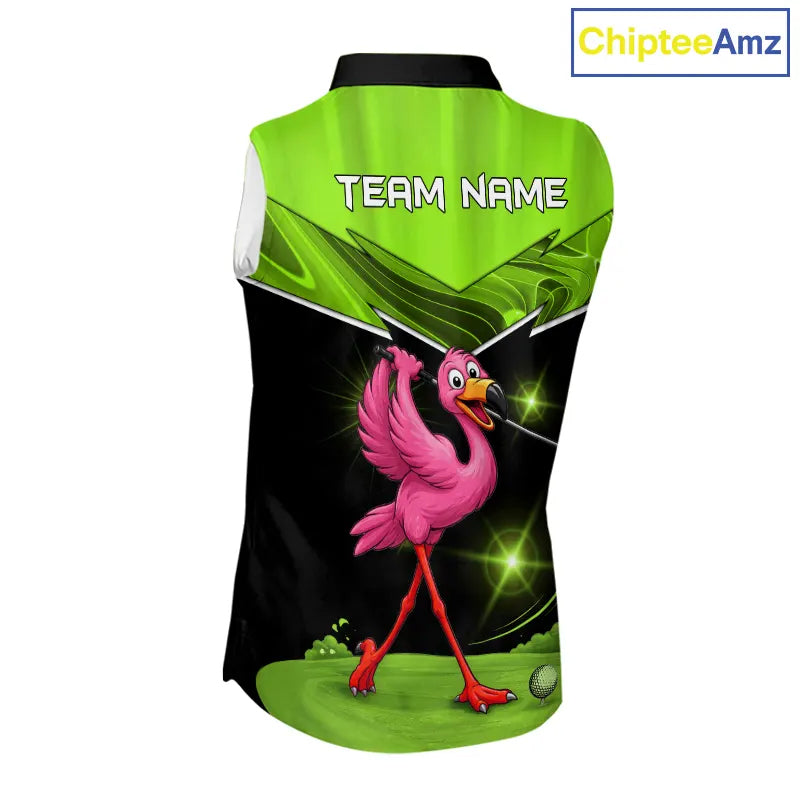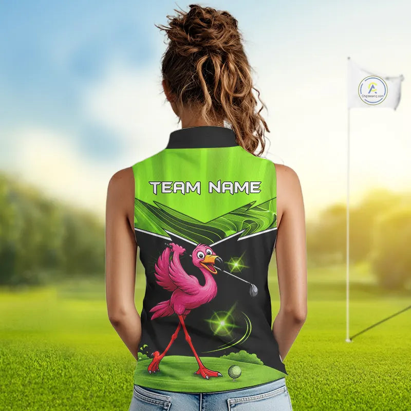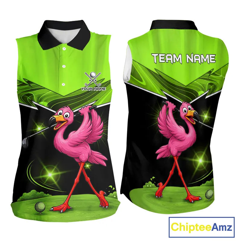 Funny Flamingo Green Sleeveless Golf Shirt Custom Flamingo Team ladies golf tops, funny golf gifts NQS11675