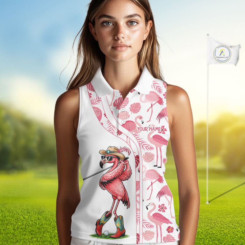 Funny White and Pink Flamingo sleeveless golf polo shirts Custom team Flamingo golf outfit ladies NQS11546