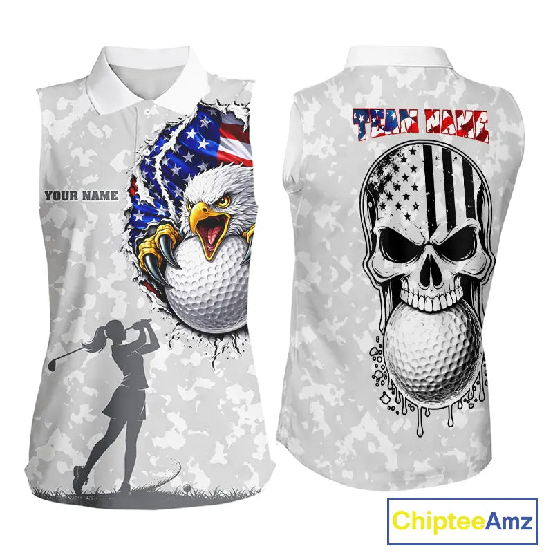 Personalized American Flag Skull Eagle Camo Sleeveless Golf Polo Shirt, Patriotic Ladies Golf Outfits NQS11649