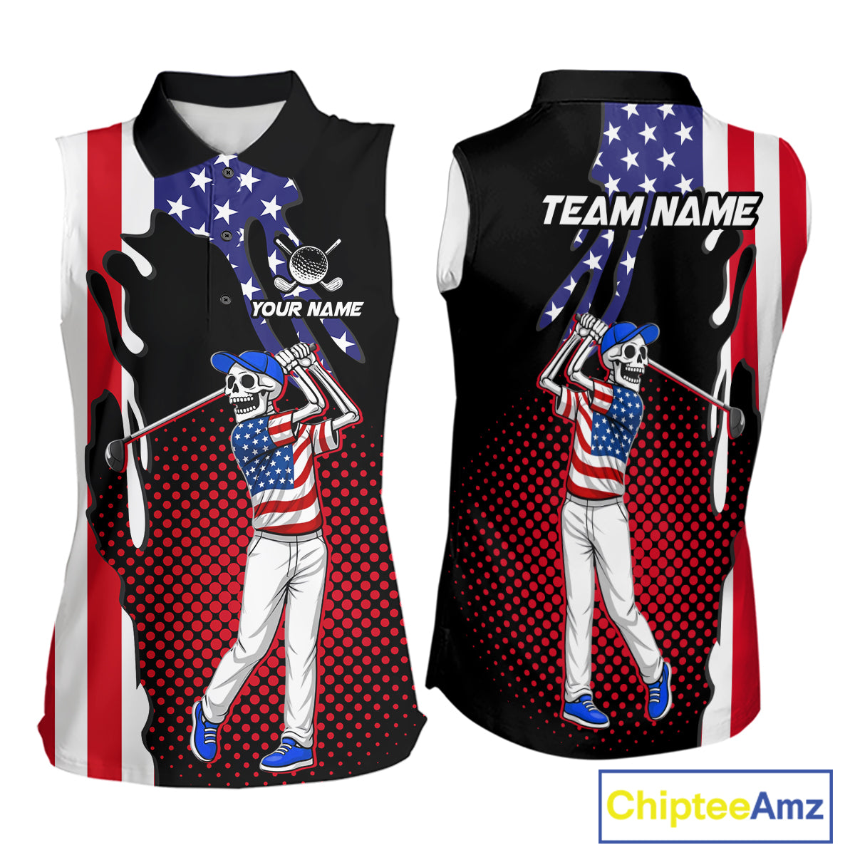 Personalized US flag golf shirts funny skull womens golf shirts sleeveless custom ladies golf apparel NQS11384