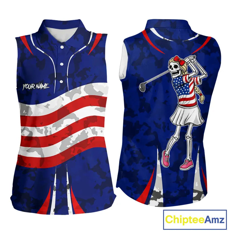 USA flag camo golf outfits funny skull ladies sleeveless golf tops custom patriotic golf shirt ladies NQS11400