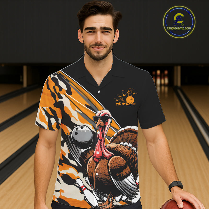 Yellow Camo Custom Funny Turkey Bowling Men And Women Hawaiian Shirt, Thanksgiving Bowling Tournament IPHW7881