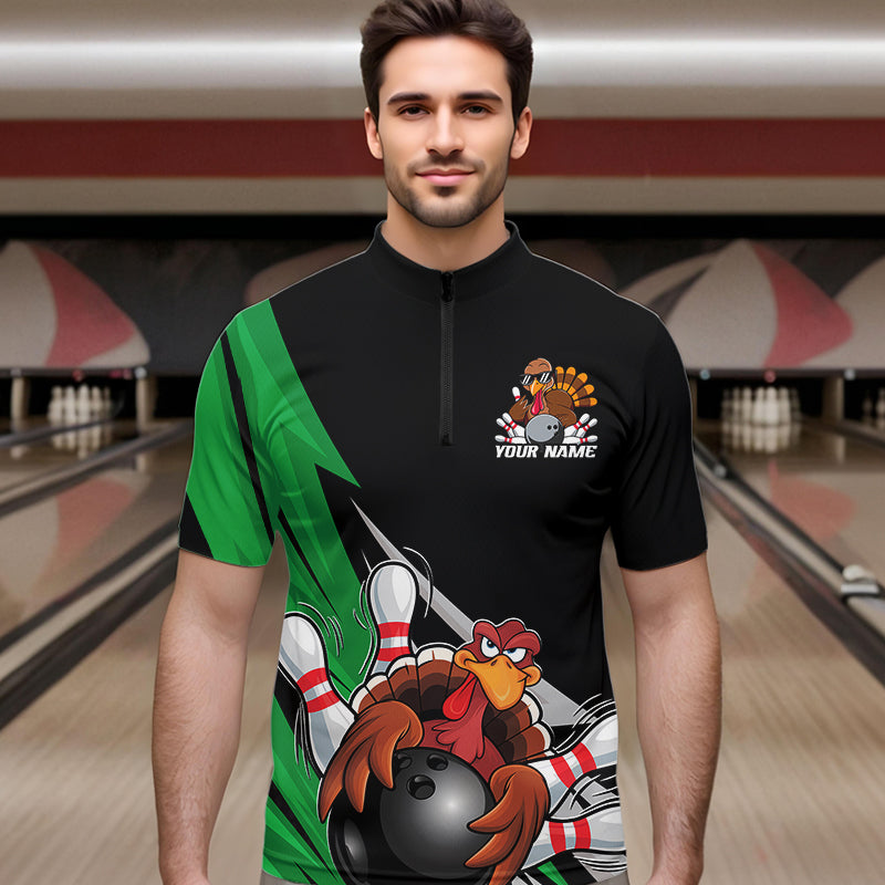 Black And Green Custom Funny Turkey Thanksgiving Bowling Team Quarter-Zip Shirts For Men IPHW8876