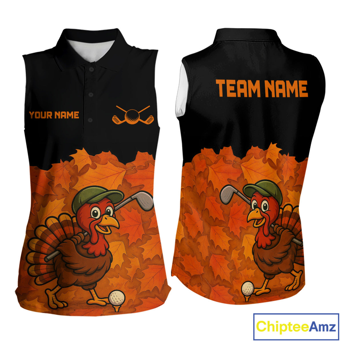 Black and Orange Autumn Leaf Custom Turkey Women Sleeveless Golf Polo Shirt, Thanksgiving Golf Attire NQS10700