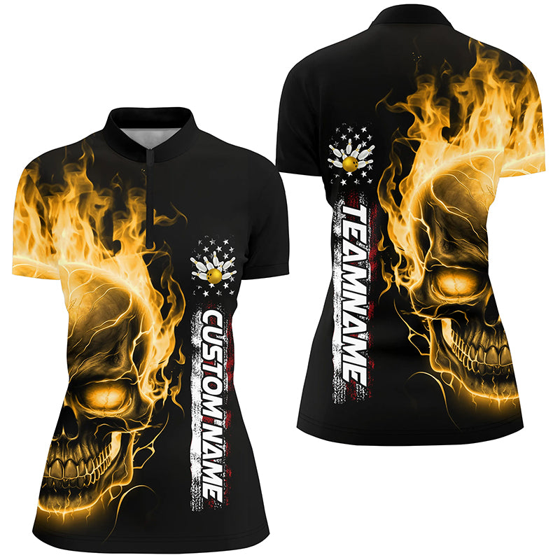 Flame Skull American Flag Custom Team Bowling Shirts For Women, Patriotic Bowling Shirt IPHW5154