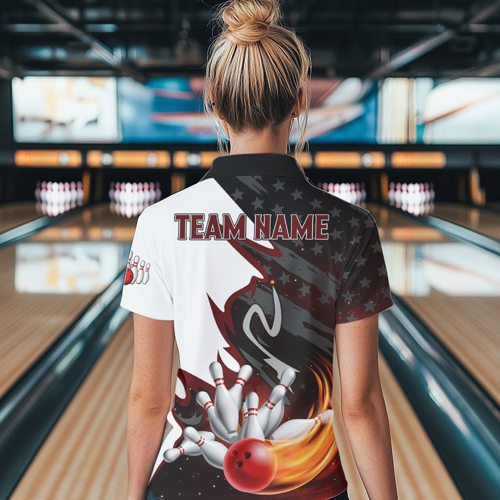 Black and White American flag Bowling jersey Custom Patriotic Bowling Polo, 1/4 Zip Shirts For Women NQS10999