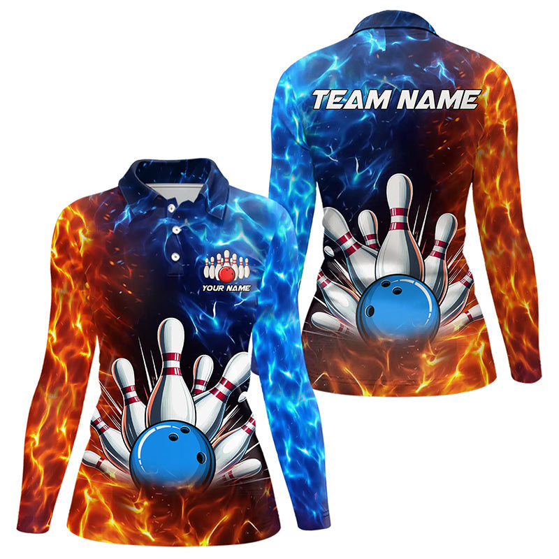Custom Blue and Orange Flame Bowling Polo, Quarter Zip Shirts For Women, Bowling Team Jerseys NQS9592