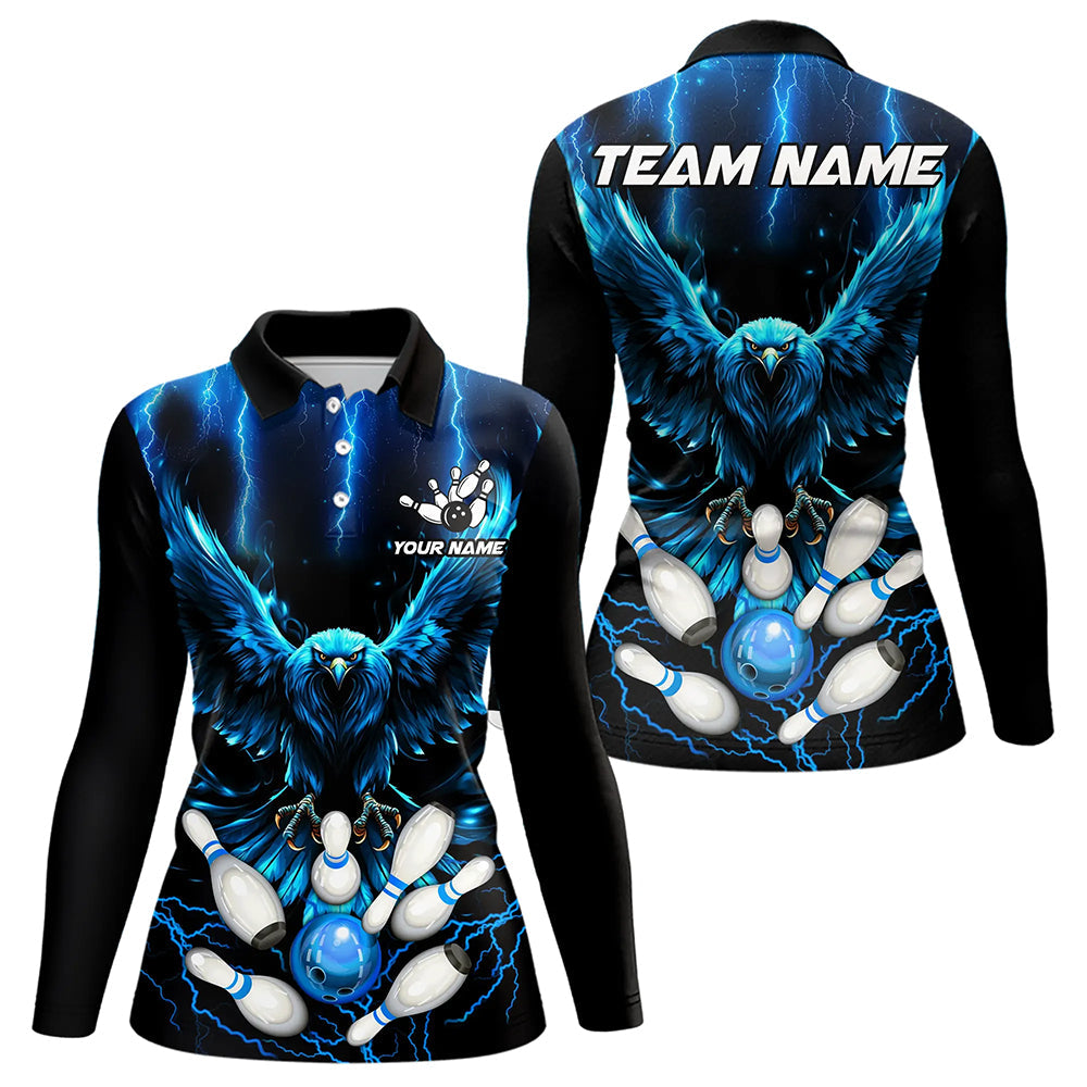 Custom Blue Lightning Thunder Eagle Women Bowling Polo, Quarter Zip Shirts Bowling Team Jersey Outfits NQS9577