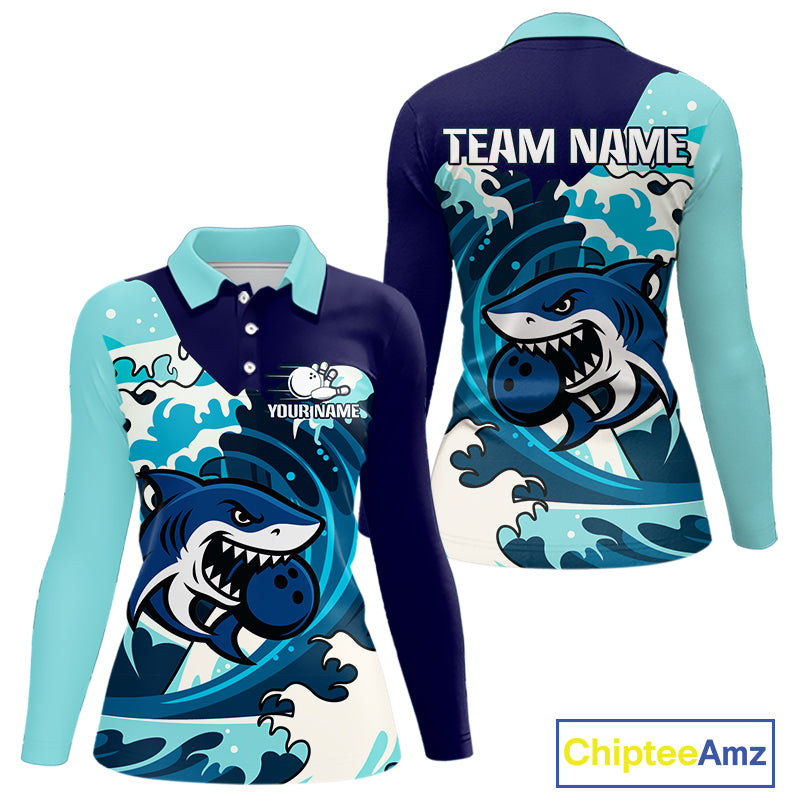 Custom Blue Shark Bowling Polo, Quarter Zip Shirts For Ladies, Personalized Shark Bowling Team Shirt NQS10469