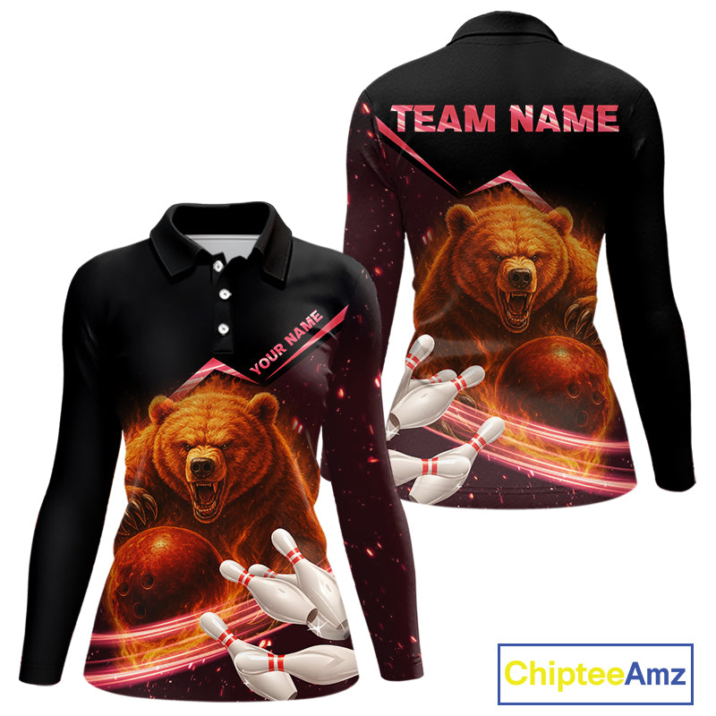 Custom Flame Bear Bowling Team Polo, Quarter zip Shirts For Women, Team Bowling Uniform NQS10321