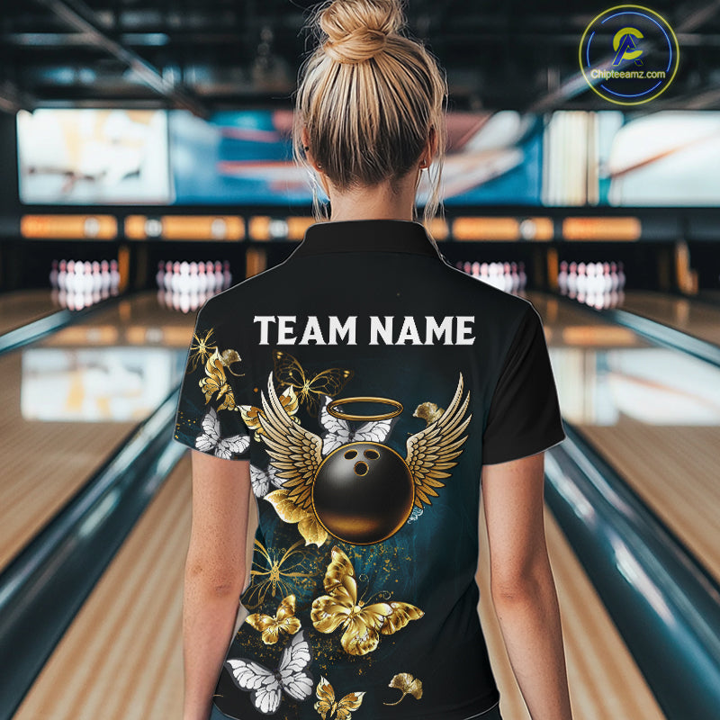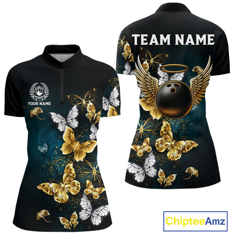 Custom Gold Butterflies Bowling Shirts For Women, Personalized Team Bowling Polo & Quarter-Zip Shirts NQS10577