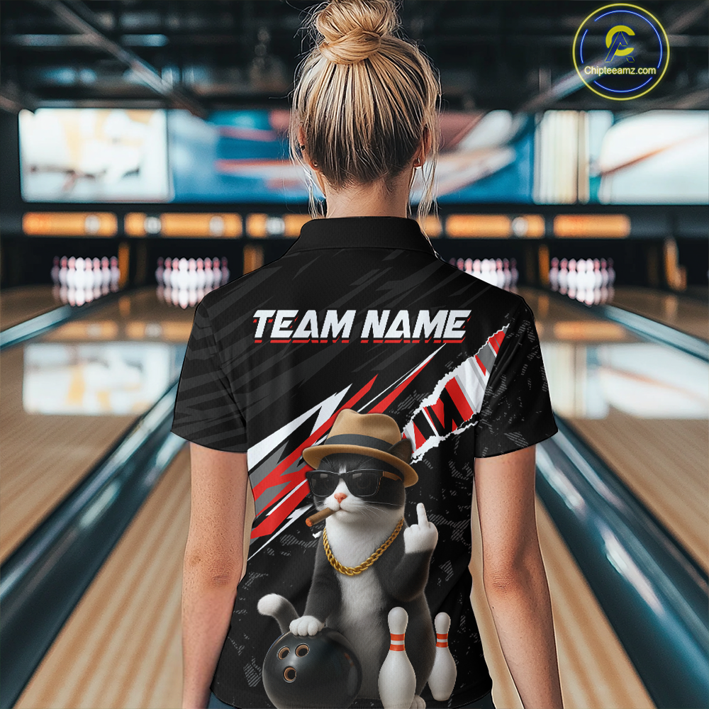 Custom Red Funny Cat Bowling Jersey for Women Bowling Shirt Polo & 1/4 Zip Bowling Team Shirts HNT136