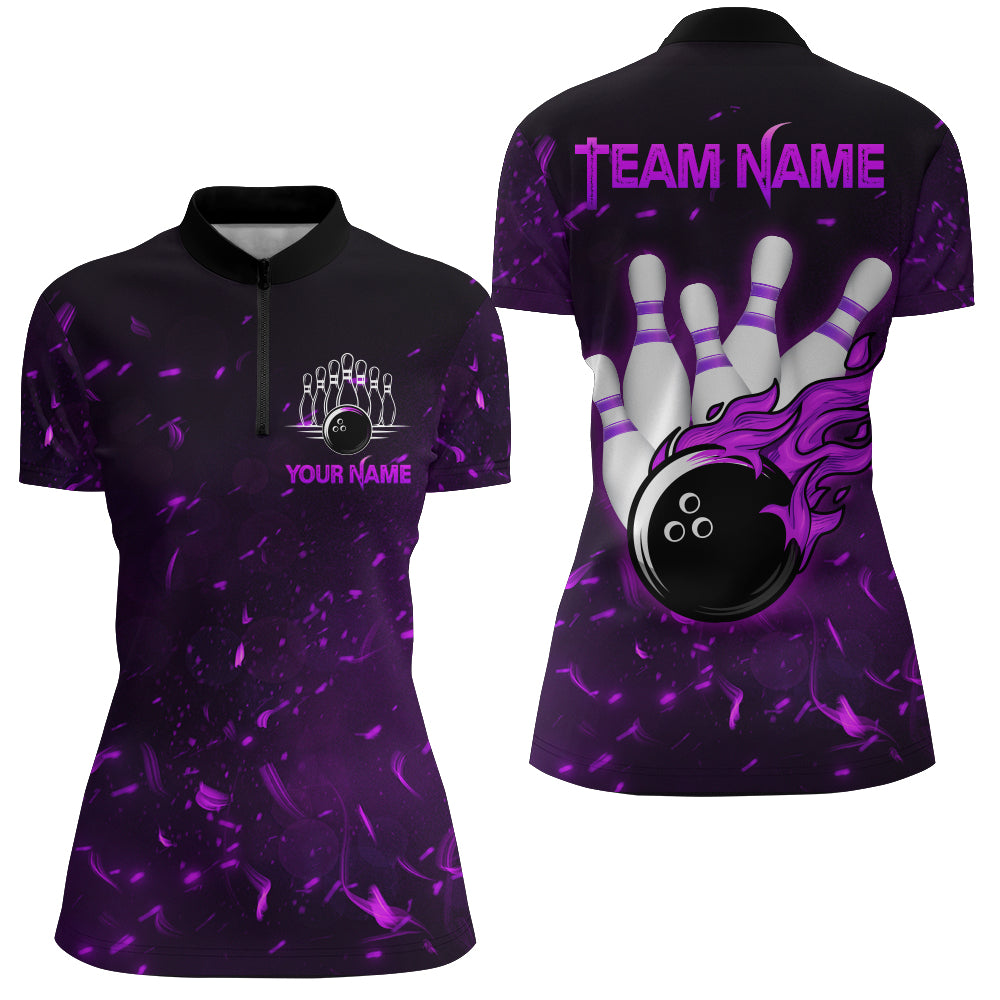 Personalized Purple Bowling Jersey Men Women Flame Bowling Quarter-Zip Shirt Bowling Shirt BDT424